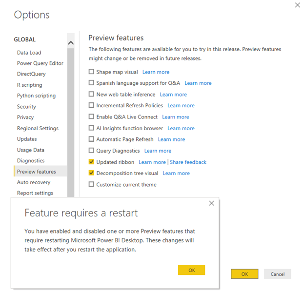 The next thing I noticed was that the report was using the Decomposition Tree visual. As that is a preview feature and I forgot to turn it on, I will need to do that now. Go to File, Options & Settings, and then Options to turn it on. We might as well turn on the new ribbon as we are here! You will see this:
