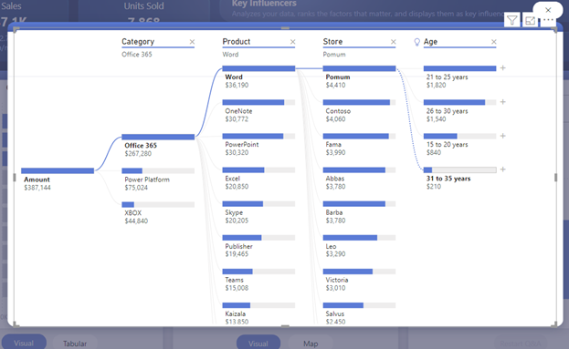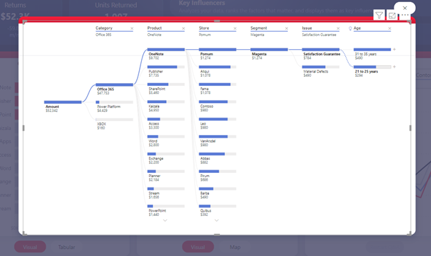 Ctrl-Click the Decomposition Tree and play around with it to see it work in action. This is a great tool to let your colleagues find insights for themselves in an engaging way. Here’s an example I created:
