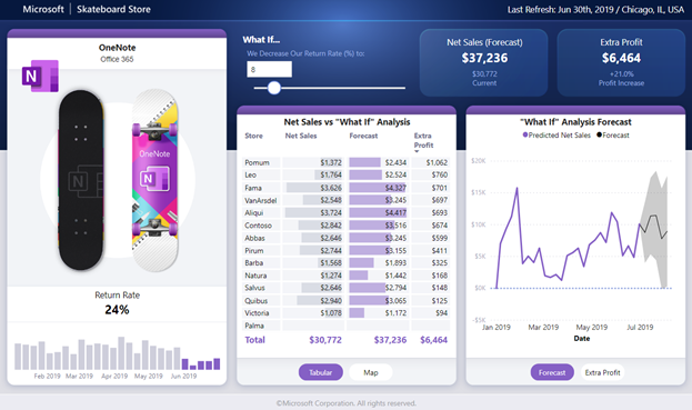 As we found out the OneNote skateboard had a high return rate of 24%. This report demonstrates the What-If capabilities of Power BI and I have moved the slider to 8% to see what the profits would be if we were able to reduce the rate of returns by two-thirds. This gives us a whopping 21% increase in profits!