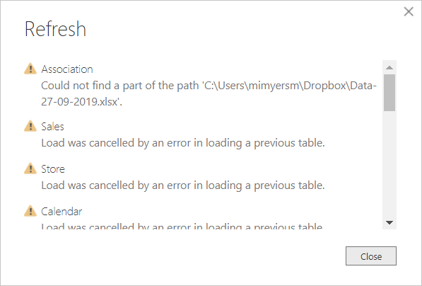 So, let’s refresh the report and see it update! You will see this – Boooo! We don’t have the Dropbox Spreadsheet file!